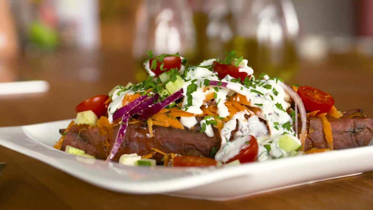 - Die gebackenen Süsskartoffeln aus dem Ofen nehmen und vorsichtig der Länge nach aufschneiden, ohne sie vollständig zu halbieren. Jeweils etwas Butter und geriebenen Gouda hineingeben, mit etwas Salz und Pfeffer würzen und alles mit einer Gabel gut vermengen. Jeweils mit Möhrenraspel, Tomaten, Gurke, Zwiebel, Oliven und Feta füllen. Mit etwas Joghurt-Sosse anrichten und mit Petersilie garniert servieren.