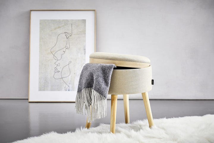 - Accessoires als Topping : Ein stylishes Finish erhält der beige Hocker durch kuschelige Details. Abgestimmte Wohndecken beziehungsweise Kissen sorgen für den individuellen Feinschliff und lassen sich auf Wunsch einfach austauschen.
