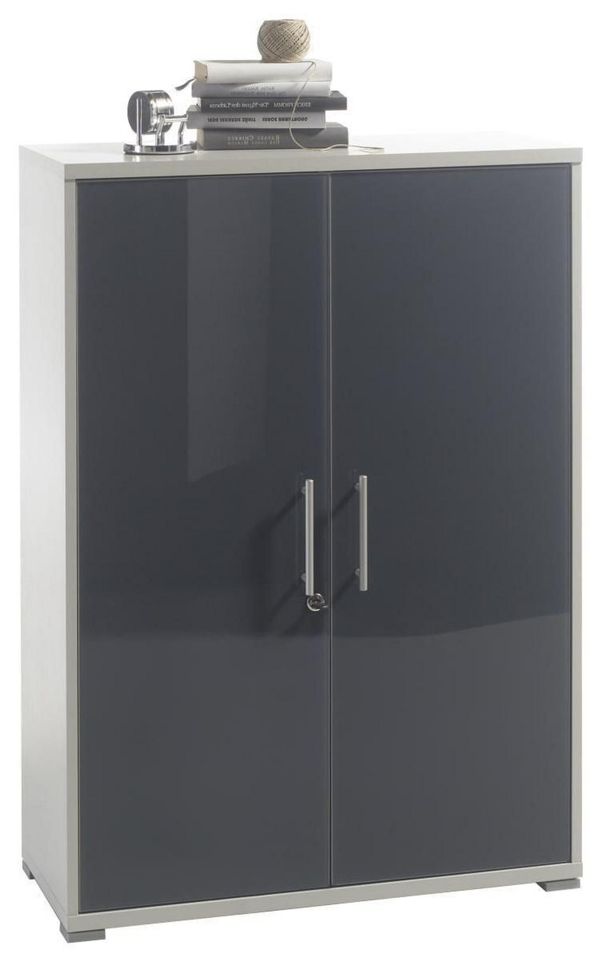 Dieser Aktenschrank (versperrbar) in Grau bereichert Ihr Büro in zweierlei Hinsicht. Denn das Möbel bietet nicht nur Stauraum, sondern sieht auch äußerst geschmackvoll aus. So begeistert das Design durch eine klare Formensprache sowie eine abgestimmte Farbstellung. Während der Korpus in einem hellen "Lichtgrau" gehalten ist, setzt die Glasfront in Graphitfarben einen dunklen Akzent. Für den letzten Schliff sorgen Stangengriffe in Silberfarben.