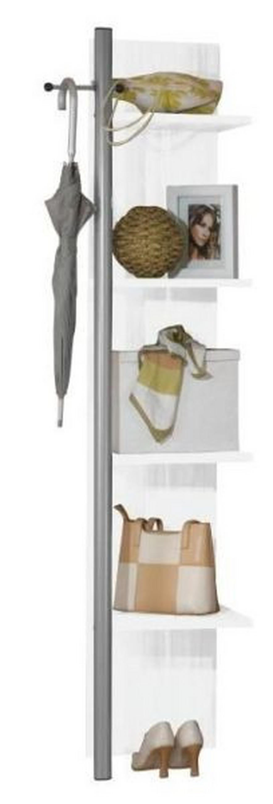 Dieses schlanke Regal ist etwas Besonderes für Ihren Flur oder Wohnzimmer! An einer ca. 195 cm hohen Metallstange ist ein praktischer Kleiderhaken angebracht. So sind Ihr Mantel, Schal oder Regenschirm stets griffbereit und gleichzeitig ordentlich aufbewahrt. Rechts von der Rundrohr-Stange sind 4 Einlegeböden an einer Rückwand aus einer Werkstoffplatte in Weiß befestigt. So können Sie in insgesamt 5 offenen Fächern hübsche Dekoideen ausstellen, Ihr liebstes Paar Schuhe präsentieren oder Handtaschen aufbewahren. Das Regal "System One" ist ein tolles Extra für Ihre außergewöhnliche Einrichtung!
