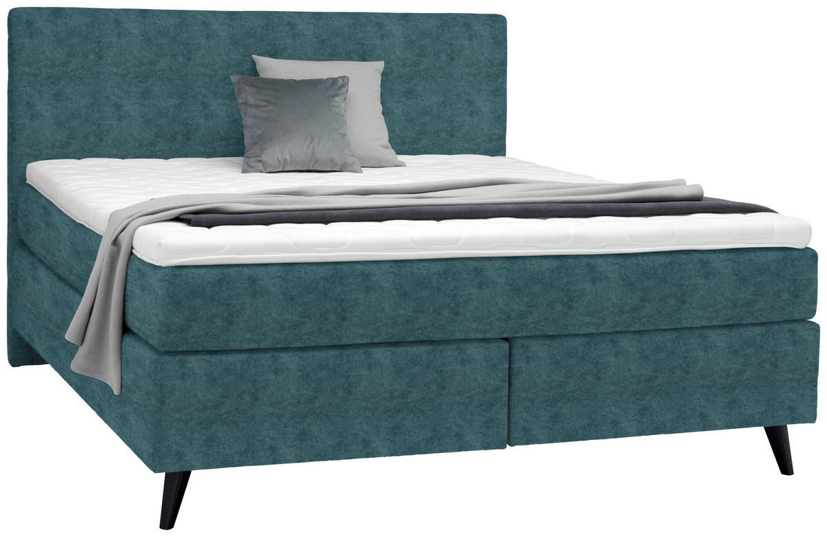 Schwarz wird das Design stimmig perfektioniert. Machen Sie es sich gemütlich in diesem Boxspringbett (ca. 160 x 200 cm) in Blau mit Matratzen, Topper und gepolstertem Kopfteil und geniessen Sie jede Minute!