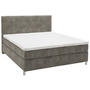 Chromfarben wird das Design adäquat vervollständigt. Dieses Boxspringbett (ca. 200 x 200 cm) in Hellgrau mit Matratze, Topper und gepolstertem Kopfteil ist der Inbegriff von Relax-Luxury!
