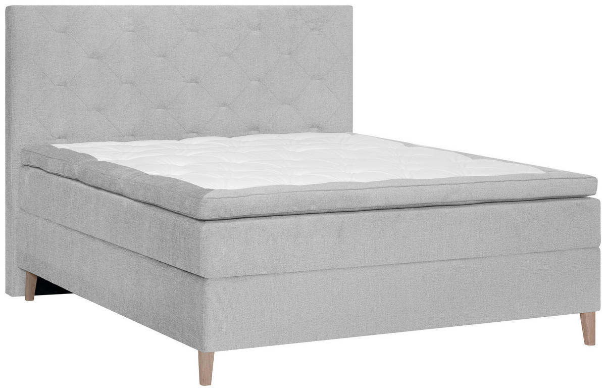 Eichefarben stimmig vervollständigt, welche zudem eine Belüftung von unten ermöglichen. Machen Sie es sich gemütlich in diesem Boxspringbett (ca. 120 x 200 cm) in Grau mit Topper und gepolstertem Kopfteil und geniessen Sie jede Minute!