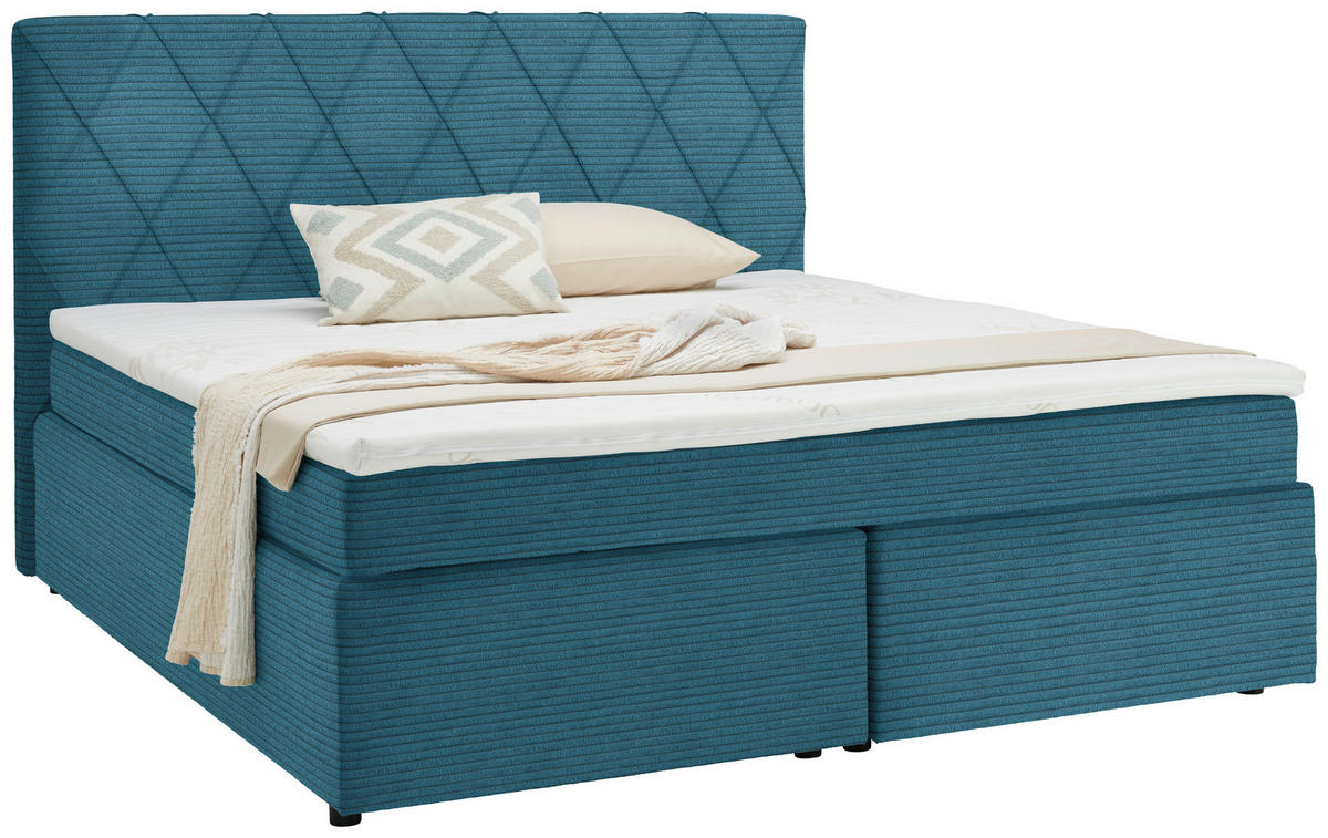 Karosteppung. Geniessen Sie pure Gemütlichkeit in diesem Boxspringbett (ca. 180 x 200 cm) in Hellblau inklusive Matratze, Topper und gepolstertem Kopfteil – so wird Ihr Schlafzimmer zum ultimativen Lieblingsort!