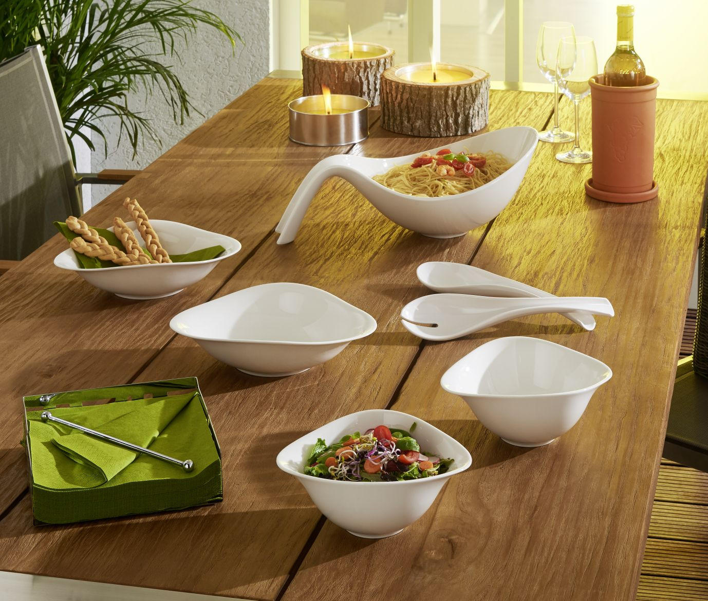 Wenn sich Speisen in Schale werfen, ist das meist eine runde Sache. Denn unter allen Geschirrteilen sind Schüsseln und Schalen im wahrsten Wortsinn Allrounder – und das selbst dann, wenn sie nicht traditionell rund, sondern etwa eckig, extravagant geschwungen oder asymmetrisch sind. Schliesslich können diese vielseitigen Talente nicht nur zum Aufbewahren, etwa im Fall von Obstschalen, verwendet werden. Ihre offene Form lädt zum Zugreifen ein, weshalb sie sich bei entsprechender Grösse auch perfekt zum Anrichten und Servieren auf Esstischen und Theken eignen. In bauchigen, tiefen Schüsseln wie etwa Salatschüsseln lassen sich grosse Mengen servieren, während in eher weiten, flachen Schalen eine Auswahl verschiedener Speisen appetitlich arrangiert werden kann. Snack- und Servierschalen haben daher oft mehrere Unterteilungen für Finger Food und Knabbereien.